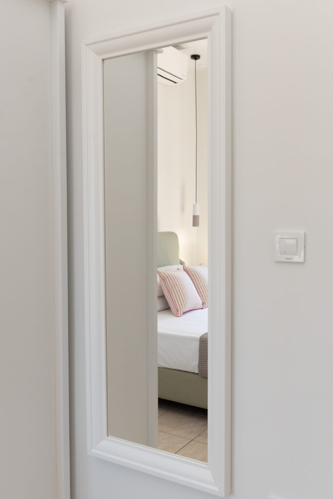 The bedroom includes a king size bed with Coco-mat bedsheets/covers and two kind of pillows , a closet, a mirror, a 32” TV, air-conditioning and luggage rack.